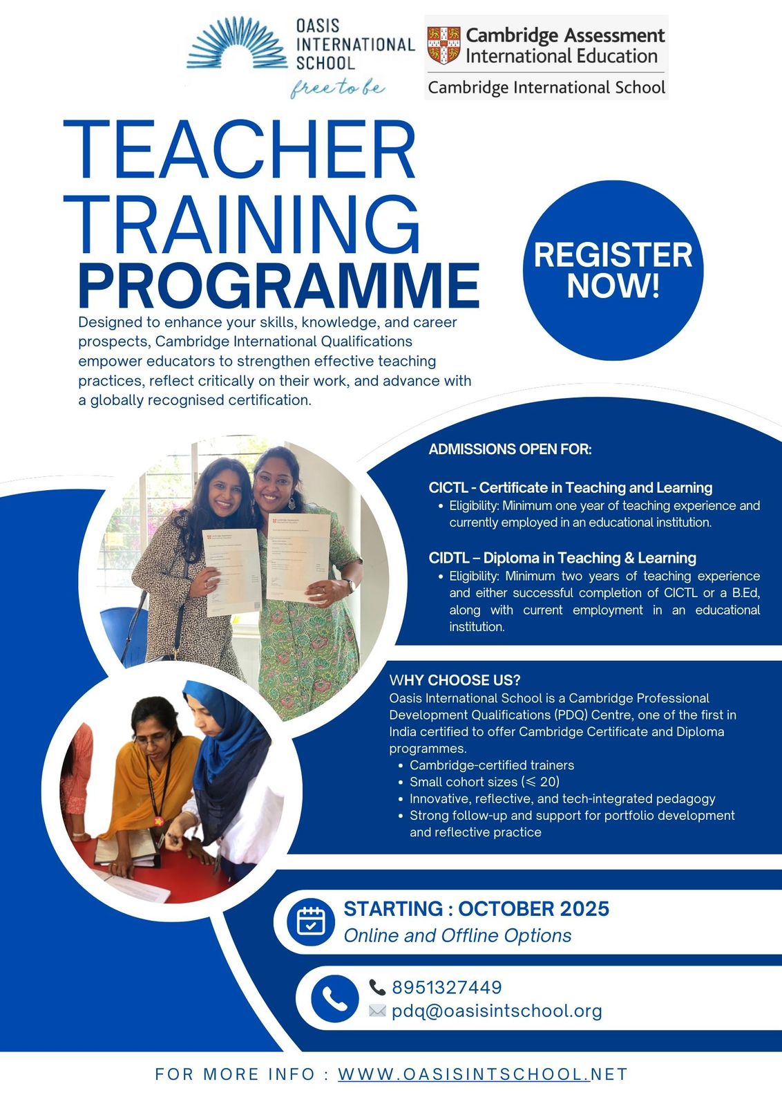 Eligibility: 2 years of teaching experience + successful completion of CICTL or a B.Ed+ currently teaching